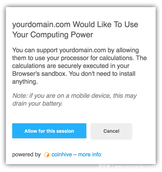 网页挖矿由于其投放简单,虽然单个用户收益率低,但容易形成规模,整体收益可观,将成为挖矿领域一个热点。网页挖矿也是原来网站广告投放的一个新的尝试,如果形式合理,用户认可,也可能取代部分现有广告形式。而非法网页挖矿,也将是继网页挂马,网络流量劫持之后,站长们要面对的另外一个网站安全问题。而防御方面,越来越多的浏览器和安全软件都将具备防网页挖矿功能。图29展示了Coinhive向用户展示的提示框。