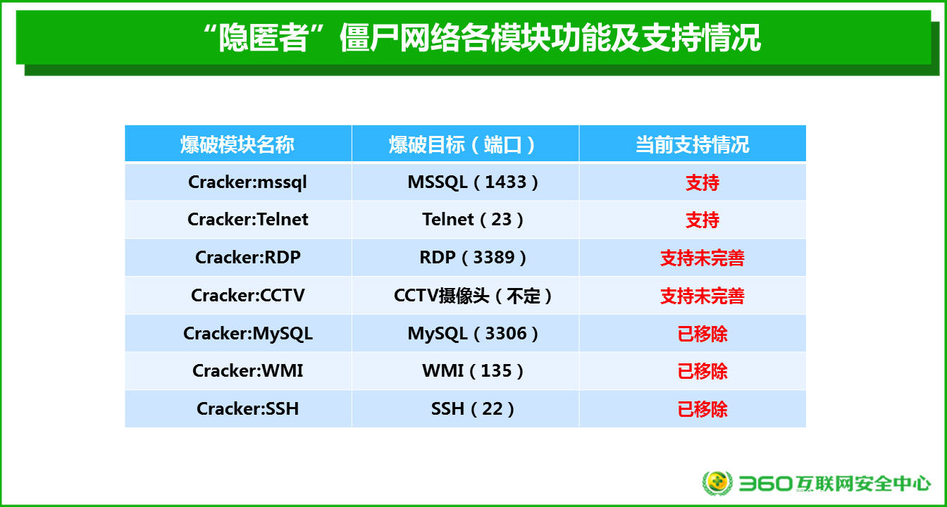 表3 “隐匿者”僵尸网络爆破模块、爆破对象以及当前支持情况