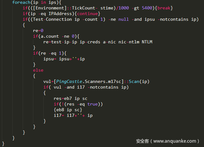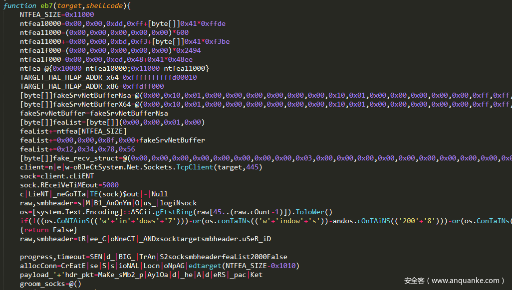 随着漏洞的更多细节公之于众,各式各样的“永恒之蓝”漏洞攻击工具问世。在2017年9月出现并呈增长趋势的“mateMiner”僵尸网络中集成了由PowerShell编写的“永恒之蓝”漏洞攻击模块。图13展示了部分攻击代码。