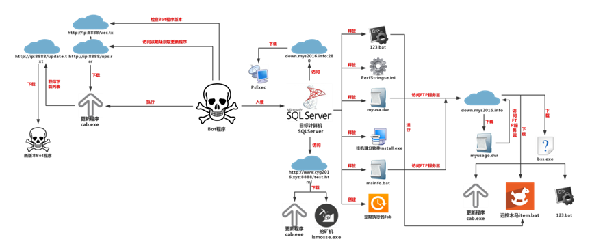- 漏洞利用工具的使用、端口扫描和爆破帮助挖矿木马僵尸网络扩张。