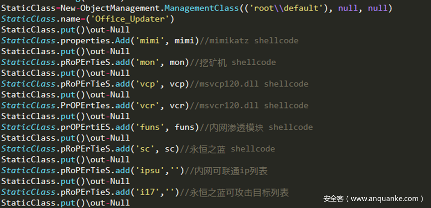 除了利用PowerShell脚本完成工作,“mateMiner”也充分利用WMI的灵活性,不仅使用WMI的__EventFilter类实现持续驻留,还将shellcode保存为WMI下类属性的值,需要时载入内存执行,真正实现“无文件”攻击。图20展示“mateMiner”使用WMI下类属性存储shellcode的代码片段。