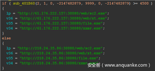 (1)通过正常更新下发挖矿木马。360互联网安全中心在2018年1月披露的网吧视频播放软件挖矿事件中,网吧视频播放器就是在2017年7月的一次更新中通过修改组件flashapp.dll的内容下发挖矿木马。由于这是一次正常的更新,无论是对于用户还是杀毒软件而言都不大容易引起注意,有效地隐蔽挖矿木马。图28展示了flashapp.dll更新后被插入的用于释放挖矿木马的代码片段。