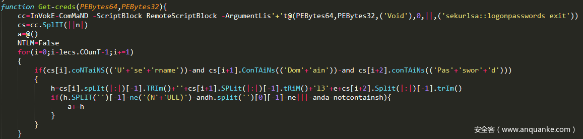 除了上文提到的攻击手法外,高级内网渗透攻击也开始出现在挖矿木马僵尸网络的扩张中。“mateMiner”僵尸网络中就使用了“pass the hash”攻击进行内网渗透。僵尸网络释放了凭证窃取工具mimikatz获取保存在傀儡机的凭证,并用其进行“pass the hash”攻击。图16展示了“mateMiner”僵尸网络凭证获取模块的代码片段。
