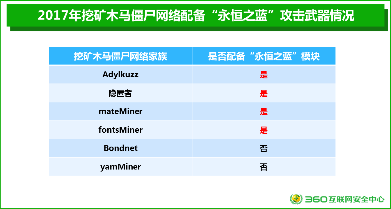 表1 2017年挖矿木马僵尸网络配备“永恒之蓝”漏洞攻击武器的情况