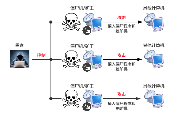 僵尸网络(Botnet)是黑客通过入侵其他计算机,在其他计算机中植入恶意程序并通过该恶意程序继续入侵更多计算机,从而建立起来的一个庞大的傀儡计算机网络。僵尸网络中的每一台计算机都是一个被黑客控制的节点,也是一个发起攻击的节点。黑客入侵计算机并植入挖矿木马,之后利用被入侵的计算机继续向其他计算机植入挖矿木马最终构建的僵尸网络就是挖矿木马僵尸网络。图4是挖矿木马僵尸网络的攻击方式简图。