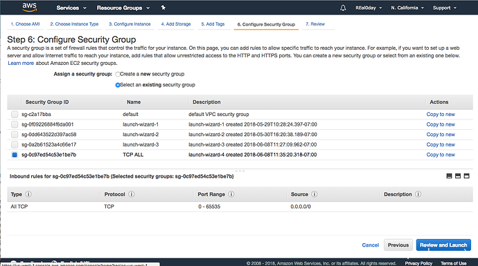 6. 对于配置安全组,需要深入介绍一下。默认情况下,AWS仅允许为你的服务器开放SSH。因此,你必须更改此设置,以便让服务器开放所有端口。是的,这很不安全,但这就是我们所需要的。