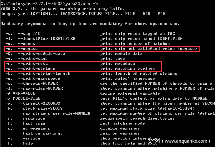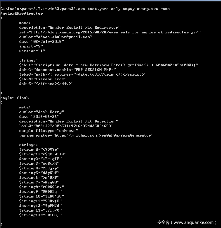使用方法:yara32.exe 已编译的规则.yarc 空规则.txt -nms