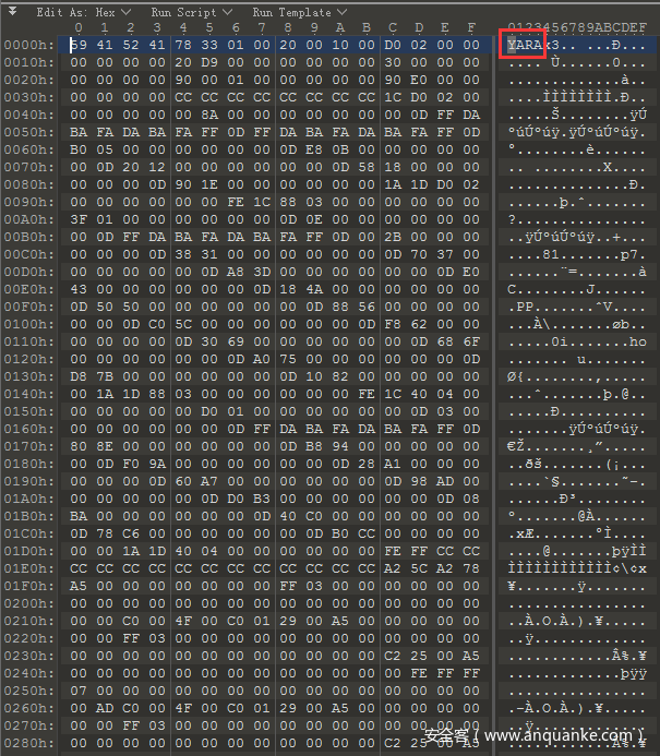 以下这张图是yara文件编译之后的二进制格式,编译之后在你使用时它会加载更快,扫描更快,并且防止源码泄露,并且不再需要编译成字节码的形式了,因为你编译之后就已经变成了字节码文件了,相比源代码扫描文件来说就少了一步了,所以更快一些,还有出于商业角度的考虑,各大杀软厂商也会通过使用编译后的yara规则提高扫描速度。