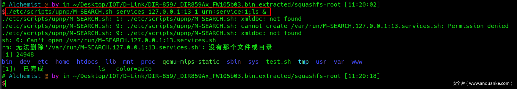 (6).根据lxmldbc_system()的第二个参数可以确定会去执行/etc/scripts/upnp/M-SEARCH.sh,这里我们进行验证拼接命令的字符串是否成功执行