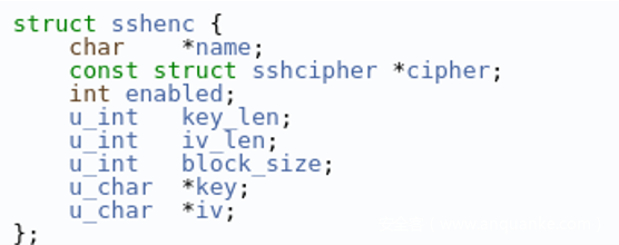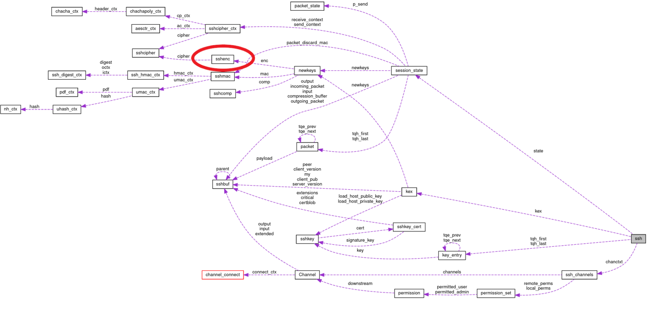 恢复会话密钥的第一步是分析OpenSSH源代码并调试OpenSSH二进制文件。我尝试自己修改并编译OpenSSH源码,将OpenSSH运行时生成的会话密钥记录下来,然后用调试器挂上OpenSSH进程,在内存中搜索会话密钥,最终成功的在堆内存上找到了会话密钥。在分析源代码中责发送和接收NEWKEYS帧的函数时,我发现有一个ssh结构体,里面有一个成员结构体叫session_state,该结构体成员依次保存着与当前SSH会话有关的所有信息,其中有一个newkeys结构体,储存着加密、mac和压缩算法有关的信息。继续往下深挖,最终找到了包含cipher,密钥,IV和分块长度的sshenc结构体。这下所有我们需要用于解密的信息都有找到了!下图是OpenSSH结构的概述: