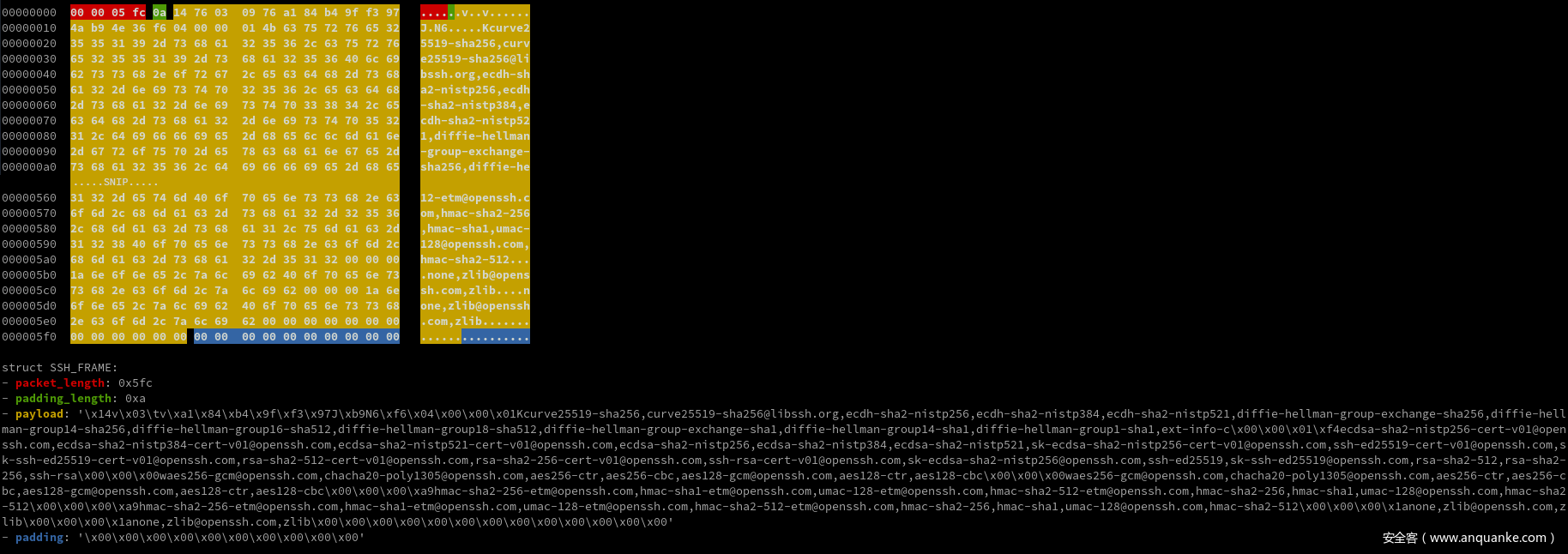 协议开始时,客户端将连接到服务端并发送协议版本和软件版本:SSH-2.0-OpenSSH_8.3,服务端返回其协议和软件版本。在交换了初始协议和软件版本后,后续所有流量都封装在SSH协议帧中。SSH协议帧主要包括长度,填充长度,数据,填充内容和MAC值。SSH协议帧示例: