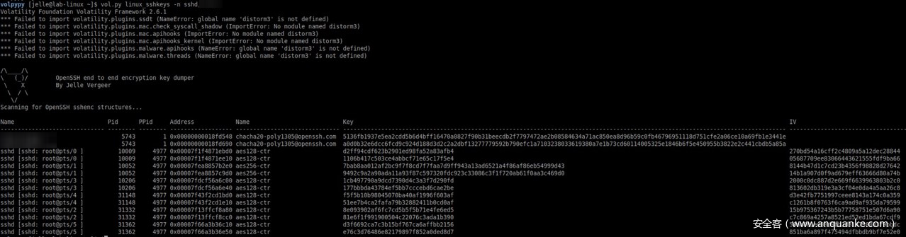 通过验证上述所有的约束条件,那么应该能够比较稳定的找到sshenc结构。我开始写一个能够用调试器挂上OpenSSH进程并在内存中搜索该sshenc结构体的Python脚本。该脚本的源代码:OpenSSH-Session-Key-Recovery。脚本的功能非常稳定,会将找到的每个sshenc结构打印出来。到目前为止,已经可以使用Python和ptrace从运行状态的机器中恢复会话密钥,但是我们如何从内存快照中恢复会话密钥呢?这就需要用到Volatility。Volatility是一个用Python编写的内存取证框架,可以编写自定义插件。经过一些尝试,我编写了一个Volatility 2插件,能够分析内存快照并抓取会话密钥!我还将该插件移植到了Volatility 3,并将该插件提交给了社区。