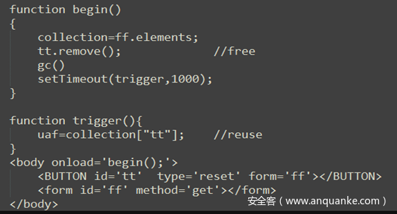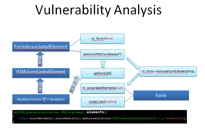 获取了form的elements属性后,form创建了包含button引用的nodeLists成员。释放button时,button的析构函数调用setform(0),setform调用removeFormElement,removeFormElement将form的m_associatedElements成员中的button移除,但nodeLists中的button没有被移除,所以释放的button可通过form.elements访问。