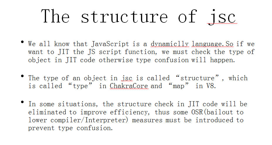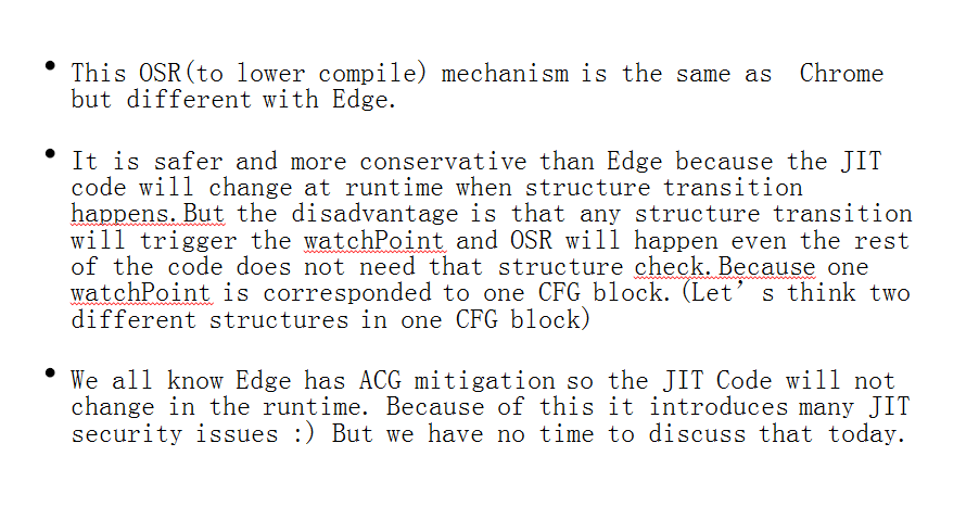 在议题中我们解读了一些JSC中的概念,例如structure,jsc的OSR机制,因为有OSR机制的存在,所以才避免了JIT中的一些type confusion,OOB R/W的问题.