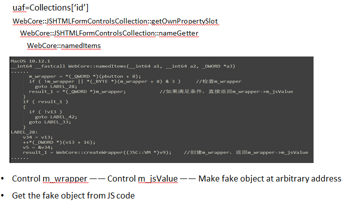 我们具体看看WebCore::namedItems的实现。在WebCore::namedItems中可以看到如果获取到的button对象的m_wrapper非空,且满足一定的条件,其指向的m_jsValue会被作为结果返回。那么我们可以利用typedarray buffer占位,控制其中的m_wrapper值,让它最终指向一个我们伪造的Float64Array,然后通过上面的调用,在js层面获取到这个伪造的Float64Array。