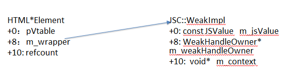 一个html对象要在js层面使用,需要一个wrapper,这个wrapper的值指向WeakImpl对象。WeakImpl对象的m_jsValue指向表示这个dom对象的JSValue对象。JSValue表示一个js可操作的实体,一个JSValue可以表示很多JavaScript原始类型例如boolean, array, 甚至包括对象和函数。