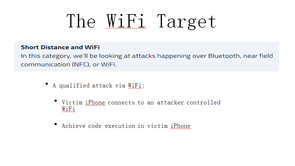在Mobile Pwn2Own 2017中我们成功pwn了两个iPhone相关的项目,分别是Apple Safari和WiFi。其中WiFi项目的要求如下: