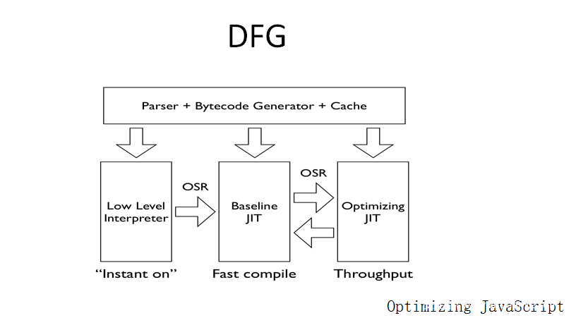 我们可以看到编译器是一个十分庞大而又复杂的模块,而通过OSR机制,编译的代码可能在不同层次的优化编译器中切换.这是Safari中JIT的一种机制,可以兼并效率和安全两种特点.