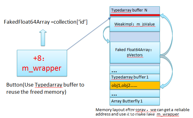 我们在堆喷的时候在typedarray的buffer里伪造两个结构:WeakImpl和Float64Array,其中WeakImpl中的m_jsValue值为伪造的Float64Array地址。