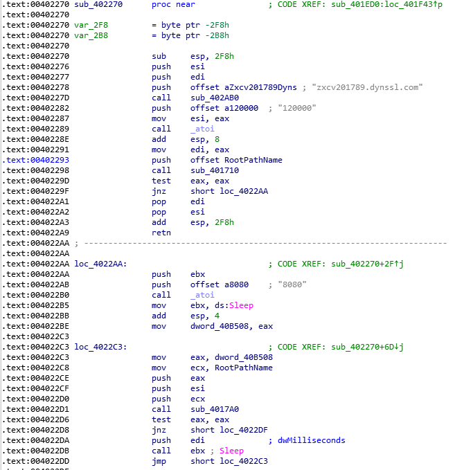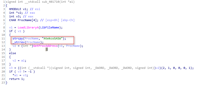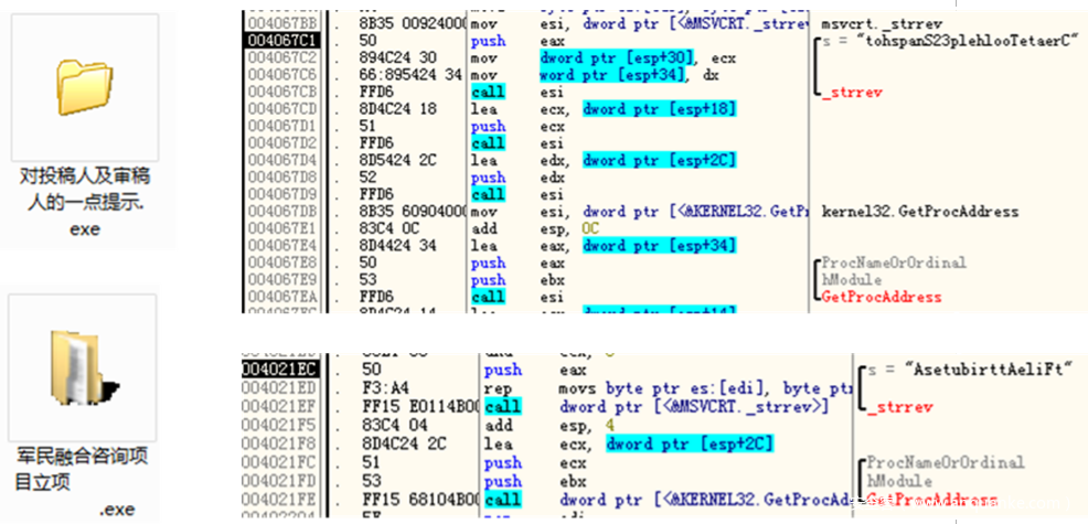 HttpBot、酷盘、XRAT、未知RAT(07~11版)木马,代码编写过程中使用了逆序API字符串。木马执行时,通过_strrev函数将逆序字符串转换为正常API字符串,最后调用GetProcAddress函数动态获得API地址。逆序API字符串增加了字符串检测难度,使得API字符串不易被检测;除此之外,API地址是在木马动态执行中获得,在PE静态信息中很难被检测到,增加了API检测难度。