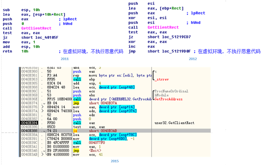 - 2011年12月,木马增加了特殊的对抗动态检测的手法(错误API参数),相关手法沿用到大部分版本的木马中,并持续应用到2015年