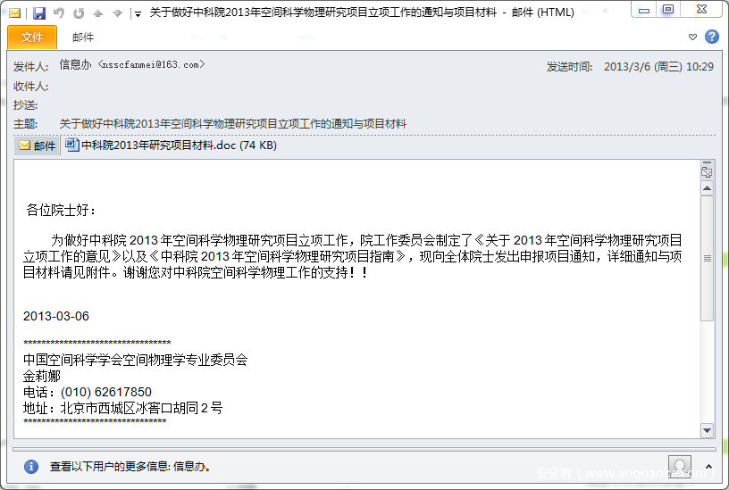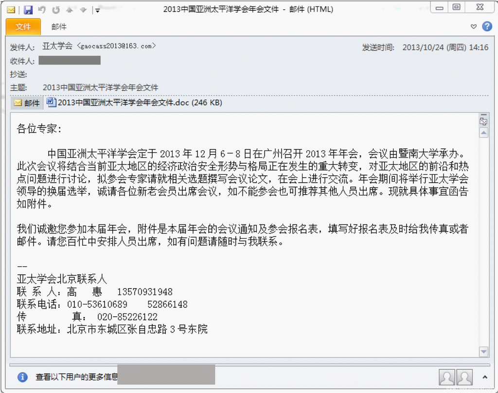| 邮件附件 | 19365fddc2fca8735d51def001704db3 | 2013中国亚洲太平洋学会年会文件.doc | virus.exp.20120158 |