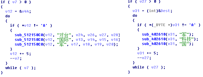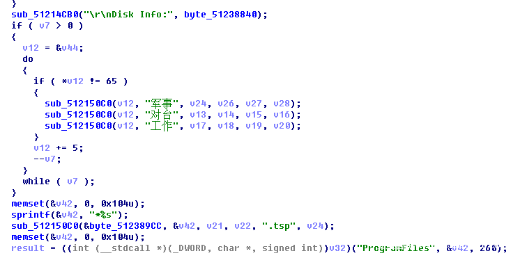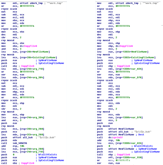 通过对比2009版代码和和2011版代码,可以看出病毒释放的子体文件名都为~work.tmp、格式化字符串都为“%s\%s.bak”,并且代码相似度极高。
