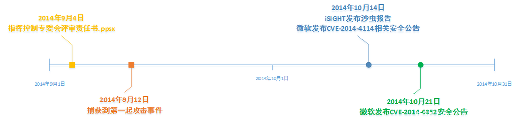 - 2014年10月14日,iSIGHT发布相关报告,并指出CVE-2014-4114(0day漏洞)。同日微软发布相关安全公告