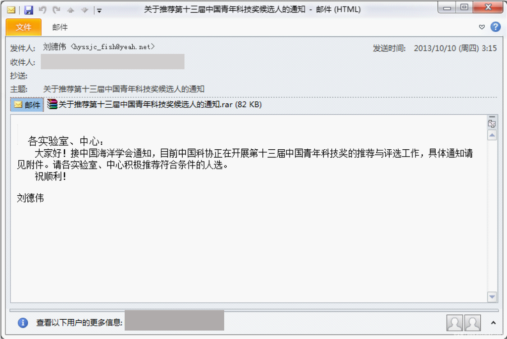 | 邮件附件 | 954f50f7ed8b4c11b59560769de0ec36 | 关于推荐第十三届中国青年科技奖候选人的通知.rar | Dropper.Win32.FakeDoc |