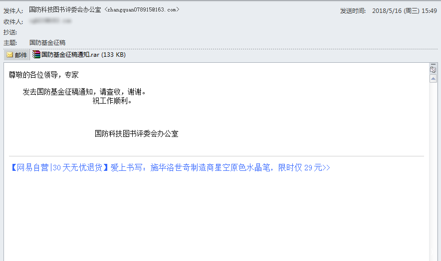 | 邮件附件 | cbeebf063f914eb3b5eba8b37302189f | “军民融合深度发展战略研究”咨询项目正式启动 .exe | Dropper.Win32.FakeFolder |