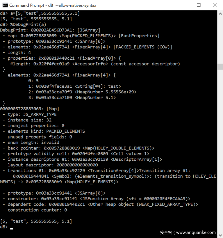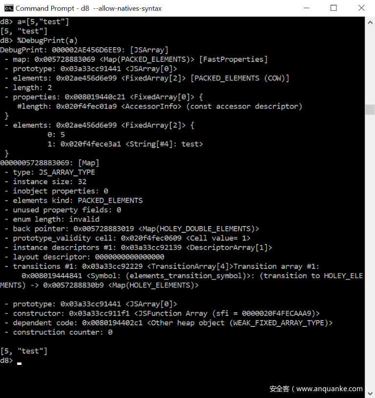 在那里将找到SMI 5,并在它下面是指向我们的字符串“test”的指针。如果记住内存是little-endian,SMI看起来像是十六进制: