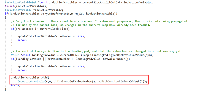 归纳变量是指循环中的自变量,循环内一个整型变量只加减常数则可认为该变量为归纳变量。归纳变量由loop prepass阶段确定: