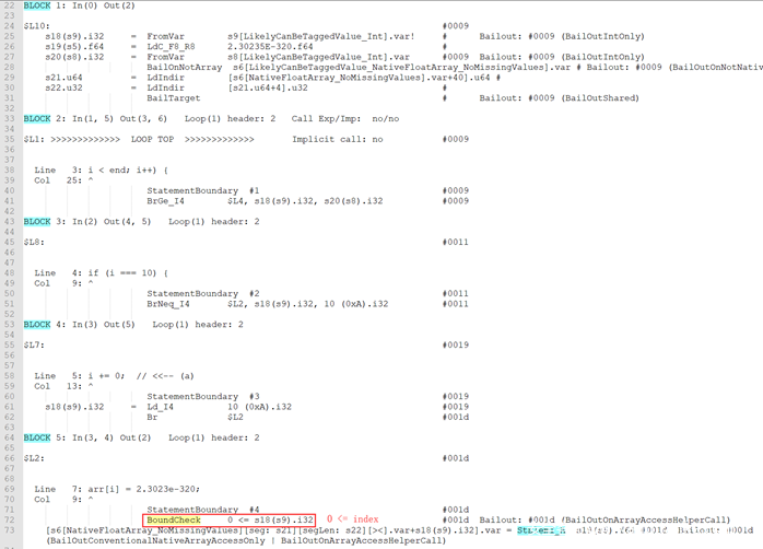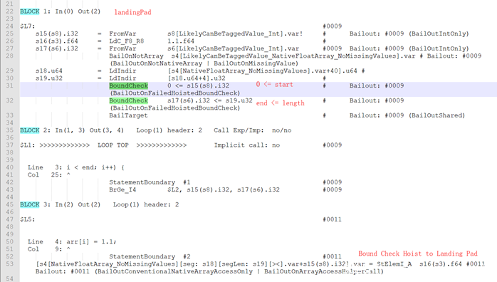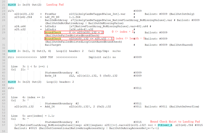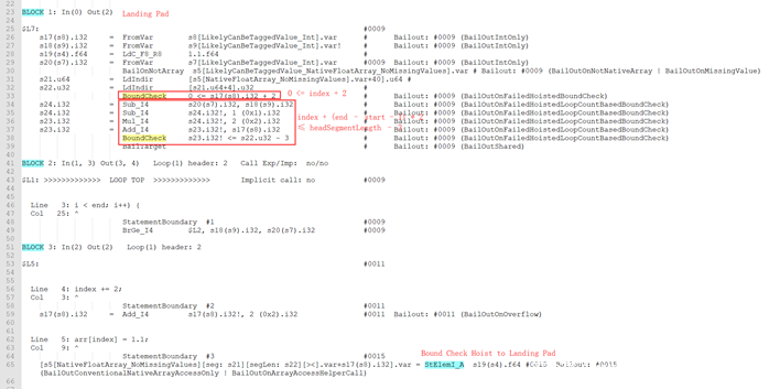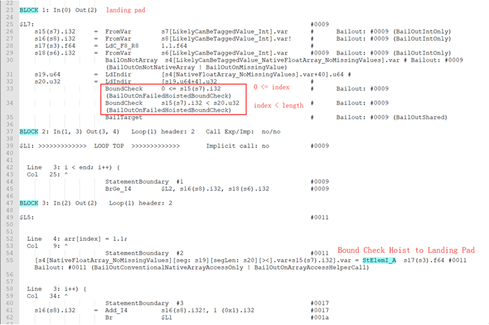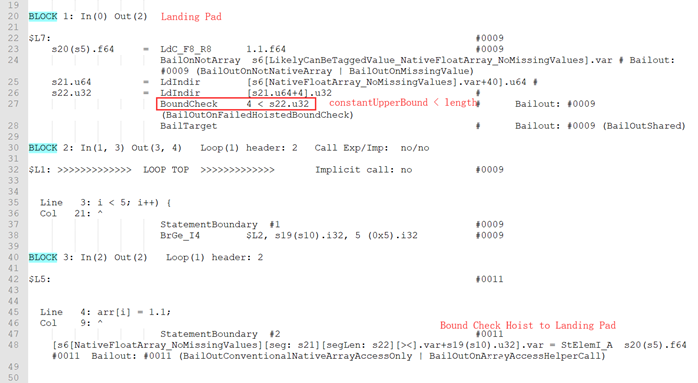 这里index = 3是一个常量,并且arr[3] = 1.1存在于loop中,因此可以把边界检查直接提升到landing pad中,同时注意到index = 3 >= 0,因此eliminatedLowerBoundCheck = true,下界检查被消除,Globopt后的部分dump如下: