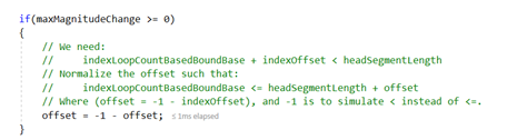 index + indexOffset + loopCountMinusOneConstantValue * maxMagnitudeChange ≤ headSegmentLength – 1