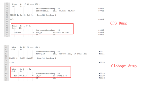 因此,Loop PrePass被认为是归纳变量的i在常量合并后在循环体内被重新定值,显然不再符合归纳变量的条件。MergePredBlocksValueMaps后indexValue从IntBoundedValueInfo转换成IntRangeValueInfo,从而丢失了相对边界。