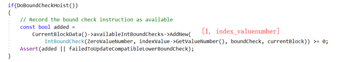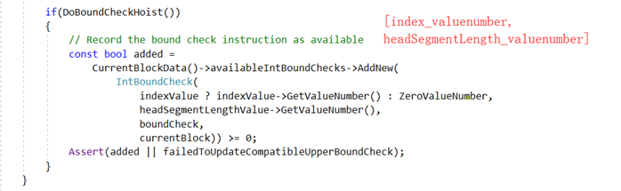 条件1中提到了compatible bound check。那么什么是compatible bound check呢?我们知道一个函数由多个基本块组成,数组的访问可能存在于多个基本块中,那么就需要对每个有数组访问的基本块做边界检查。显然这个操作是可以进行优化的,优化的方法是取每个基本块边界检查的相同集合的子集合并到一个基本块中做检查,而每个基本块边界检查的集合保存在globOptData.availableIntBoundChecks中,由IntBoundCheck对象的leftValueNumber和rightValueNumber属性索引: