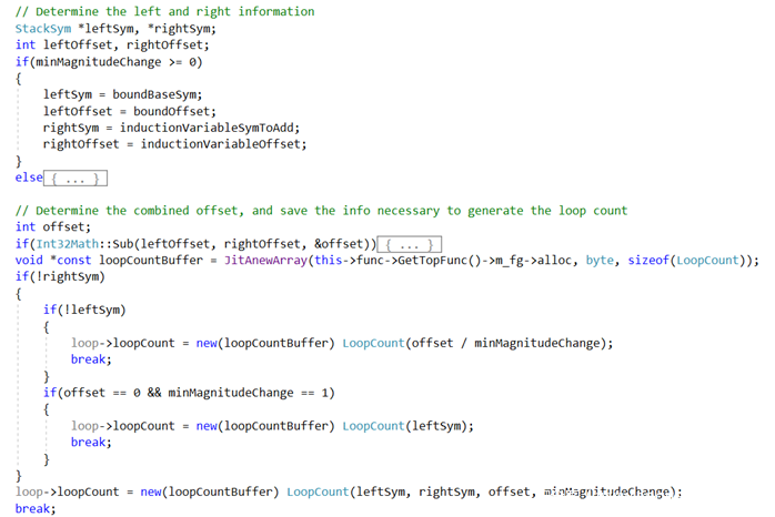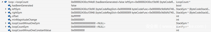 当归纳变量具有有限范围的常量边界且没有相对边界时,left = right = NULL,loopCountMinusOne唯一确定为loopCountMinusOneConstantValue = offset / minMagnitudeChange。否则不生成loopCount,只保留loopCount相关信息(leftSym, rightSym, offset, minMagnitudeChange)。
