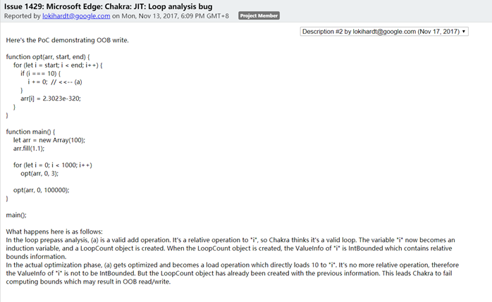 微软在2018年5月的安全更新中加入了Spectre漏洞缓解措施,同时也封堵了所有数组的OOB漏洞。随后微软又对这种影响数组访问效率的缓解措施做了一些优化,于是S0rryMybad在他的blog中提出了一种将有限OOB转换为数组MissingValue错误状态的巧妙思路,非常值得大家学习,具体细节可以阅读参考文献2。
