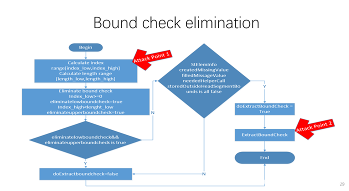 根据上面的分析,Bound Check Optimize主要分为Bound Check Elimination和Bound Check Hoist两部分。错误的Elimination或者Hoist都会引发Array Out-Of-Boundary (OOB)漏洞,下面将分别介绍这两种优化引发的漏洞。