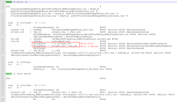 如果类似arr[index] = 1.1这样的数组元素访问语句存在循环体中,或者多个基本块中,那么每次都做这样的检查操作就会比较耗时并且也是没有必要的。因此Chakra的JIT引擎根据数组访问的各种情况进行分类优化,主要包括Bound Check Elimination和Bound Check Hoist。