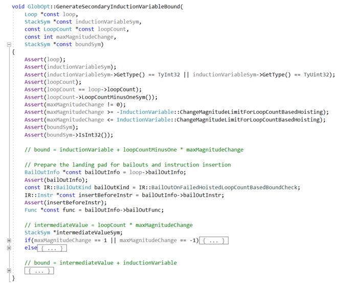 简单地说,当归纳变量具有有限范围的常量边界时,在MergePredBlocksValueMaps时就生成loopCount。为了后面计算归纳变量的上界方便,Chakra计算loopCount-1即loopCountMinusOne,具体计算公式: