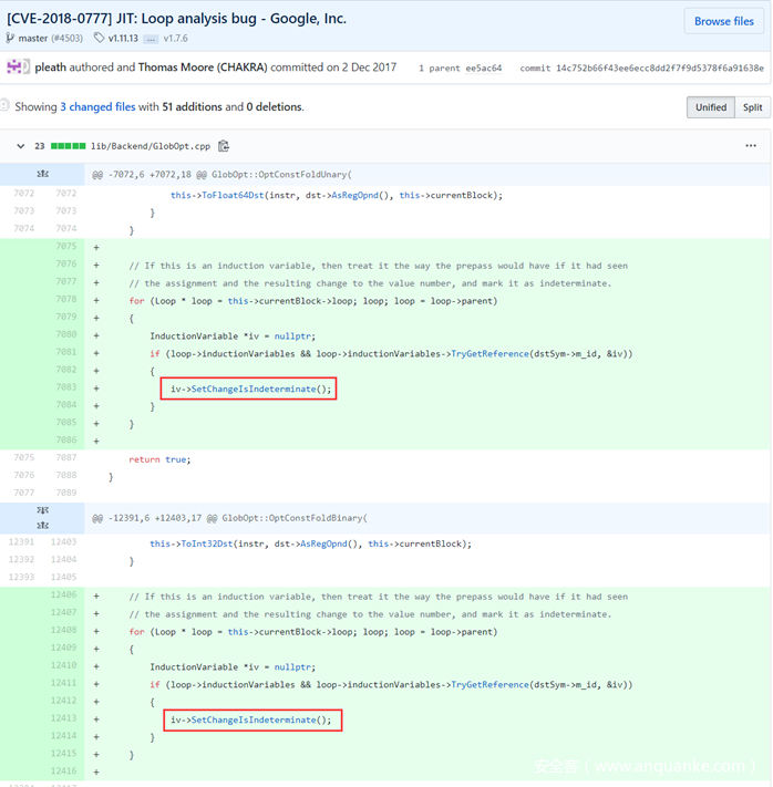 通过上面的分析可以知道,在actual optimization phase阶段,常量合并导致归纳变量i丢失相对边界,但是Bound Check Hoist仍然使用条件6进行边界检查从而导致边界计算错误,最终消除了Hoist到Landing Pad的上界检查。因此这个漏洞的根本原因是没有考虑到常量合并中存在归纳变量的情况,补丁如下: