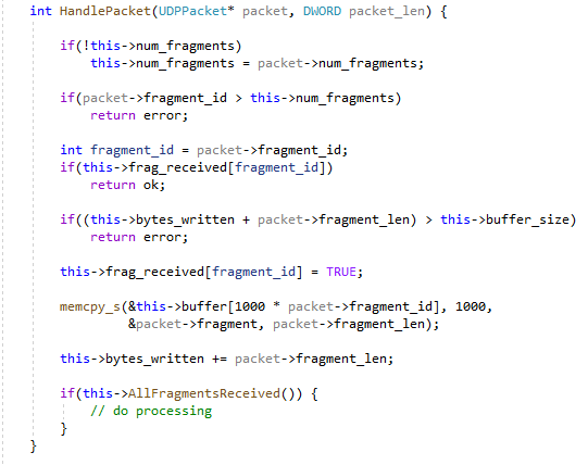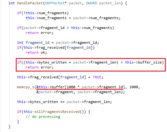 memcpy_s会将每个分片(fragment)拷贝到重组缓冲区的某个偏移量,重组缓冲区在堆上分配,每个分片的偏移量由fragment_id乘以1000计算得出。然而,这里的边界检查逻辑并没有考虑到偏移量这个因素。这里我们可以假设buffer_size等于1000,然后我们发送包含2个分片的消息。