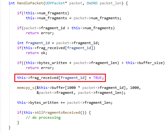 上图中的类对象维护了32位无符号整数组成的一个数组(每个数组元素对应1个分片),当收到1个分片后,相应的数据元素值会从0修改为1。当所有元素都被设置为1时,代码完成消息重组,开始处理整个消息。该数组最多容纳64个元素,但fragment_id的取值范围为0到65535。代码唯一执行的验证操作就是确保fragment_id值小于num_fragments(后者同样可以被设置为65535)。因此,我们可以将fragment_id设置为65到65535之间的任意值,将在数据边界外写入1(TRUE)。虽然只将1个值设置为1可能很难实现RCE效果,但即使最小的改动也可以对程序正常行为带来巨大的影响。