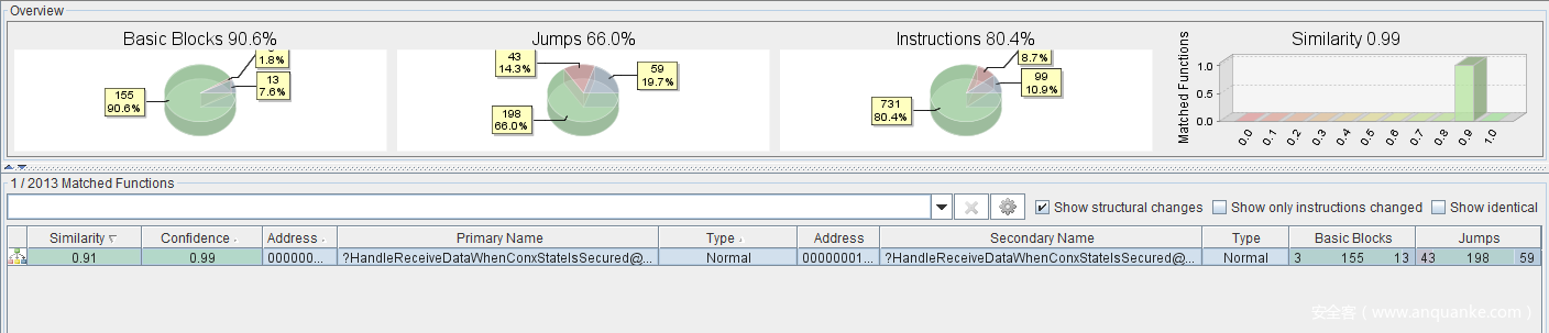 图1. BinDiff分析打补丁前后的RDG可执行文件