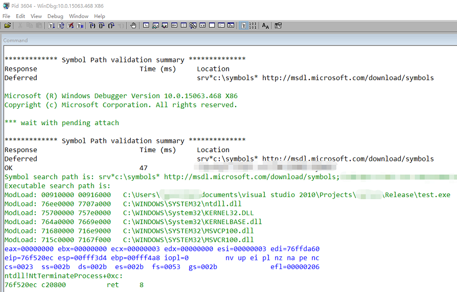 07 00fff558 00911897 00fff5fc 7664ba90 00fff62c MSVCR100!terminate+0x33