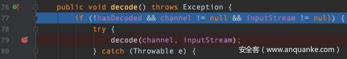 跟进该方法后可以看到该方法内首先会进行一个if判断,判断完成后会调用DecodeableRpcInvocation.decode()方法并传递进去两个参数,其中有一个inputStream参数,我们详细看一下该参数的内容