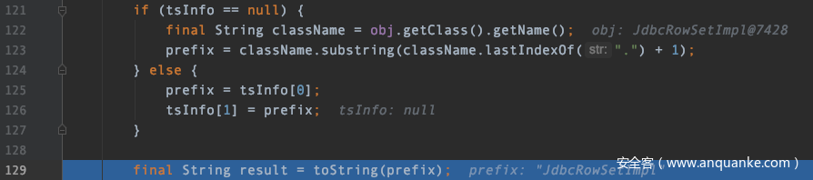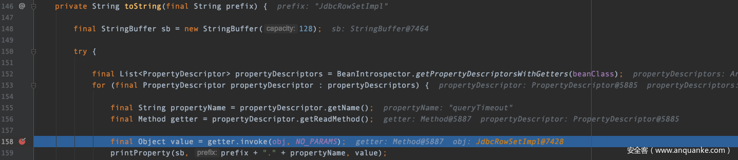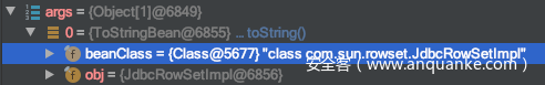仔细观察一下此时args指向的ToStringBean对象的详细内容,可见此时ToStringBean对象有两个属性已经被赋值为JdbcRowSetImpl。