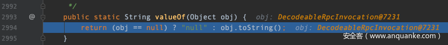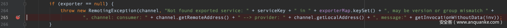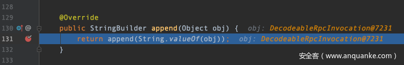 在DubboProtocol类的第263行代码中经过一个if判断然后判断成功会抛出一个RemotingException,关键点就在这里,可以看到传入的参数中采用了字符串拼接的形式,当使用字符串拼接的时候,会自动调用StringBuilder的对象的append方法,依次处理channel.getRemoteAddress()的返回值,channel.getLocalAddress()的返回值,getInvocationWithoutData(inv)的返回值,而getInvocationWithoutData(inv)的返回值正式含有恶意请求的DecodeableRpcInvocation对象,StringBuilder要调用DecodeableRpcInvocation的toString方法将其转化为字符串